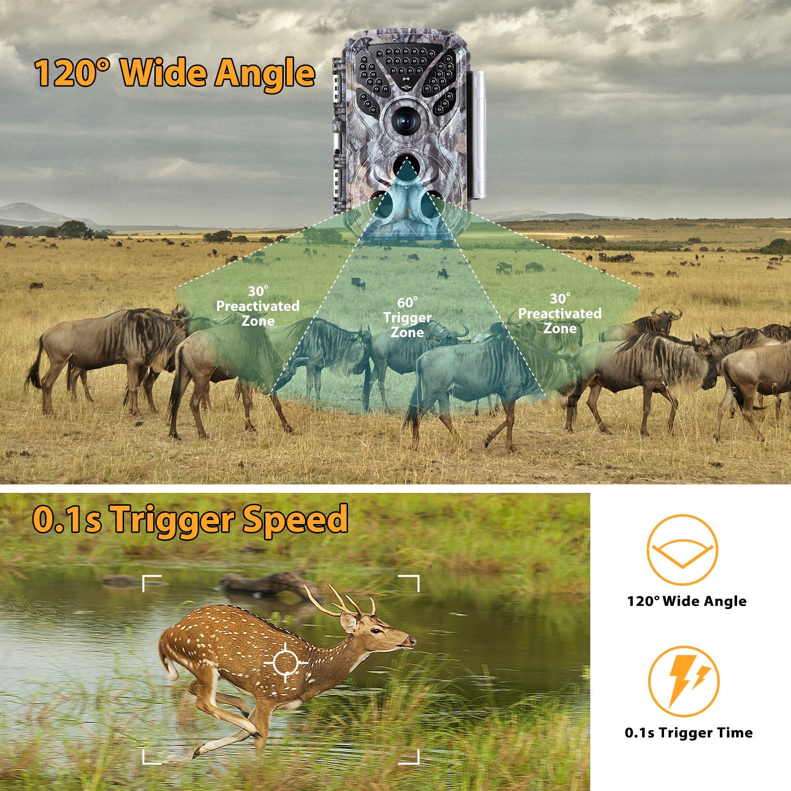 • 120° PIR detection angle and trigger in 0.1s