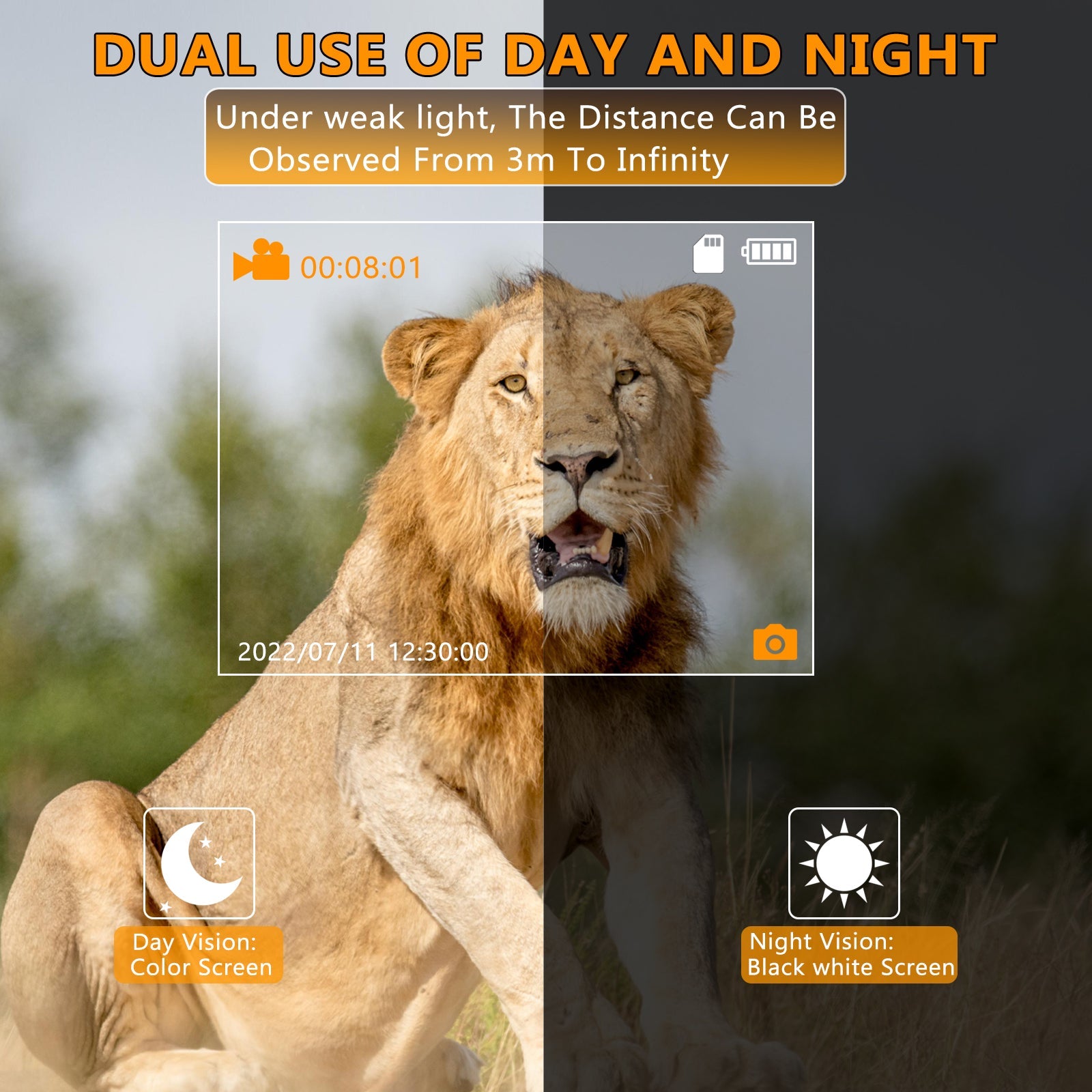 PERFECT VISUAL EFFECT - High-performance digital monocular night vision, with 3X magnification and 4X digital zoom, could be used as a telescope, camera, and video, getting HD photos and videos, practical and convenient.